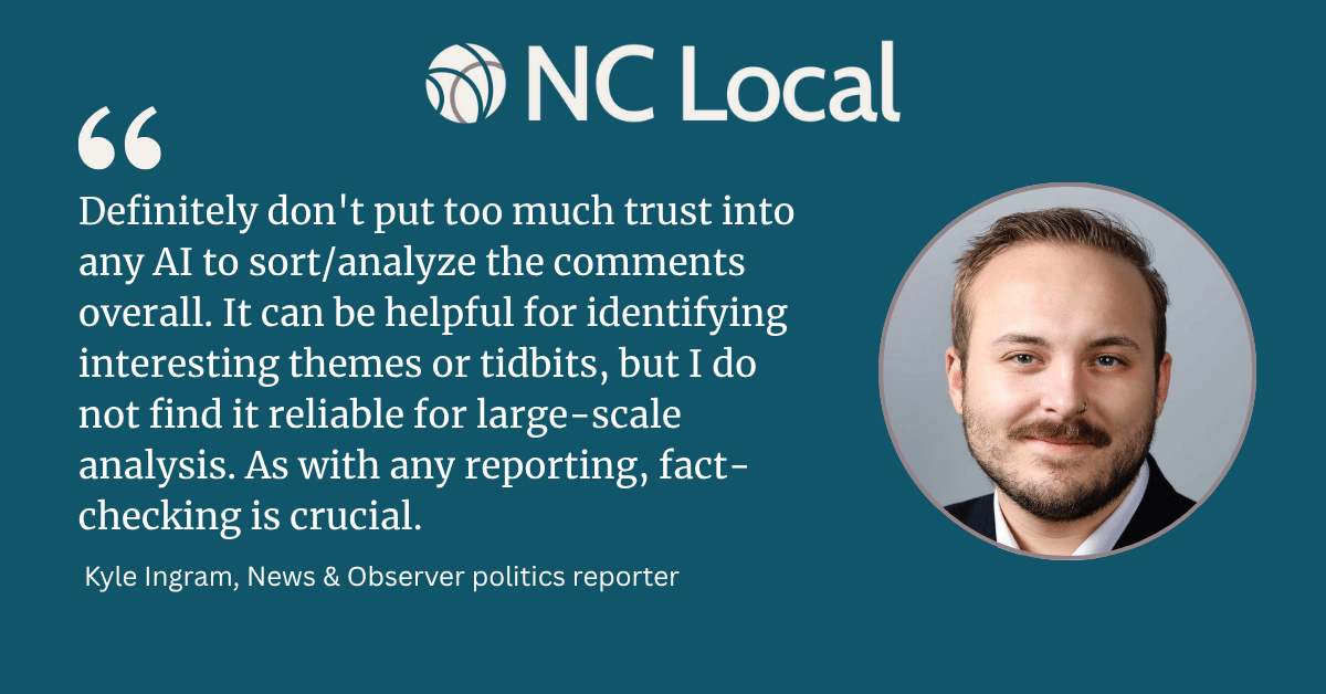 Kyle Ingram: Definitely don't put too much trust into any AI to sort/analyze the comments overall. It can be helpful for identifying interesting themes or tidbits, but I do not find it reliable for large-scale analysis. As with any reporting, fact-checking is crucial.