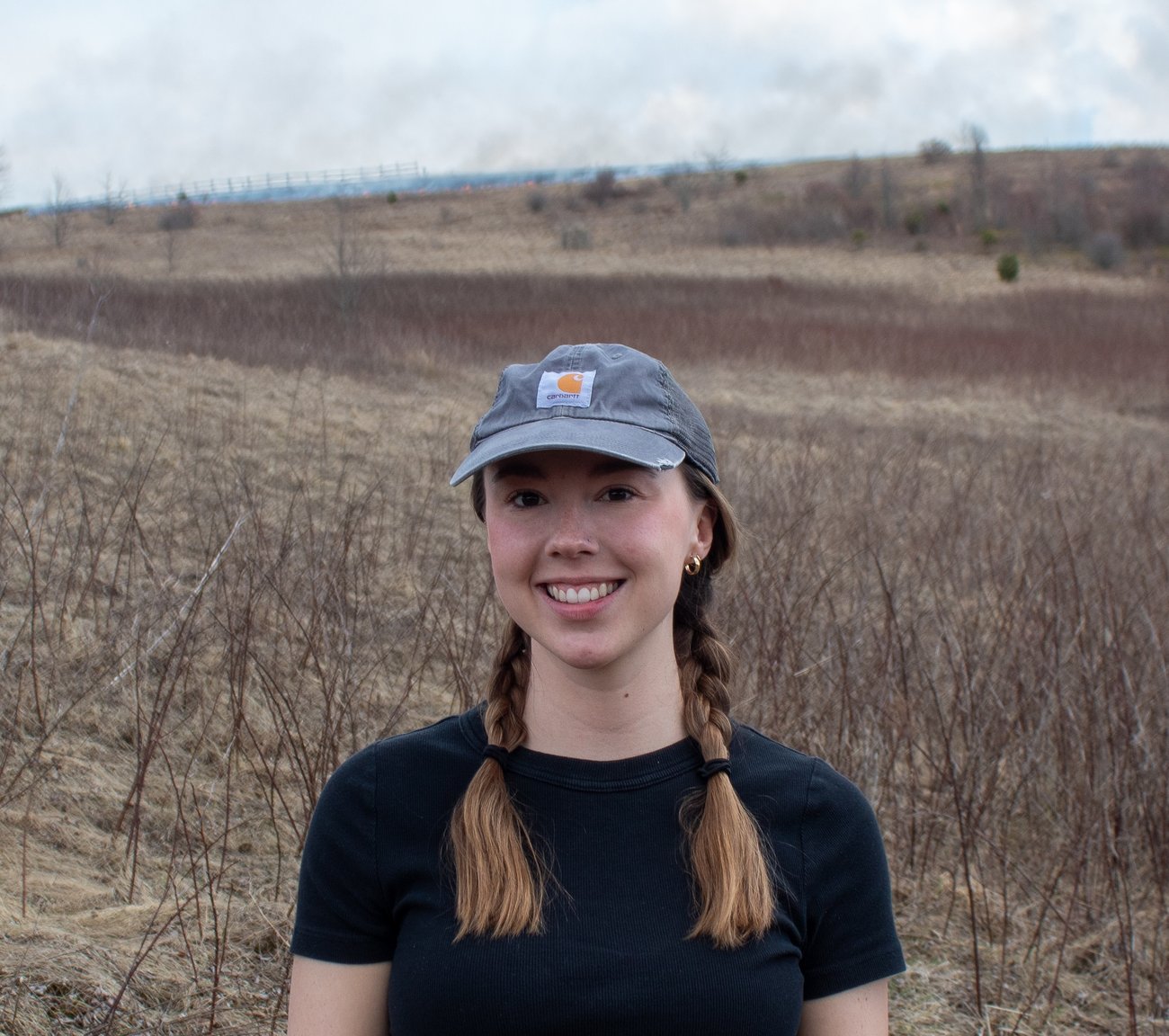Lilly Knoepp reporting at Max Patch. You can see the smoke on the hill from the prescribed burn. (Mary Grace Bedwell/U.S. Forest Service) |