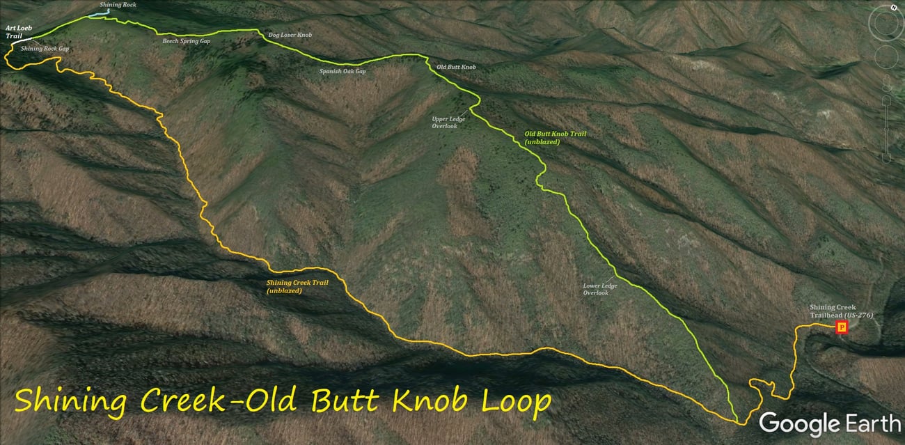 Dave recommends this trail because he likes loop trails. To take this loop start at N.C. 276 at the Shining Creek Trailhead, then wind up to the Shining Rock and return on the Old Butt Knob Trail. Dave provided the below map of the loop. |
