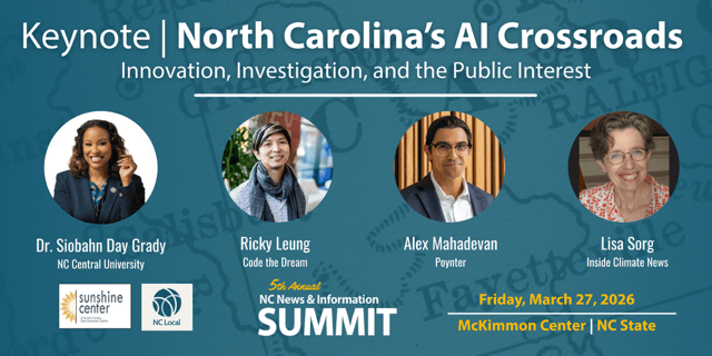 Join Poynter's Alex Mahadevan, Inside Climate News Reporter Lisa Sorg, NC Central's Dr. Siobahn Day Grady and Code the Dream's Ricky Leung to explore how we harness AI's potential for news and information while addressing accountability challenges facing our profession, our state, and the communities we serve.