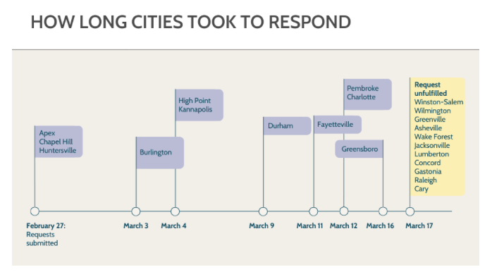 On the last Friday of February, NC Local and our media partners asked 22 North Carolina cities for the same set of records: all emails sent to or from the city’s clerk between 9 a.m. and noon on February 24.